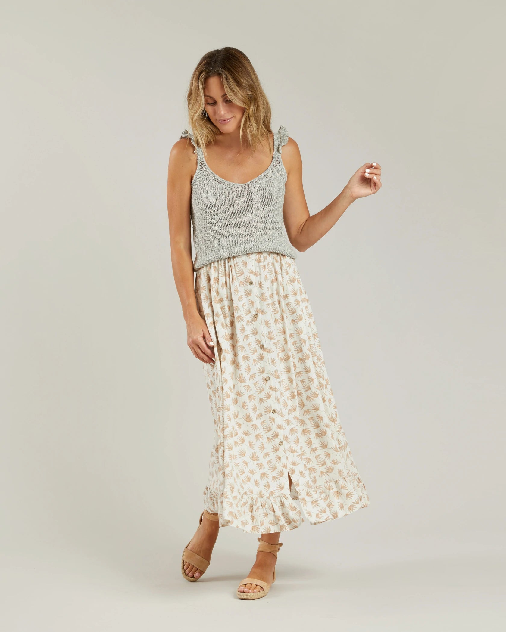 New Knit Tank features a ruffle sleeves detail and a V -neck in the front. Pairs great with our Knit Shorts.